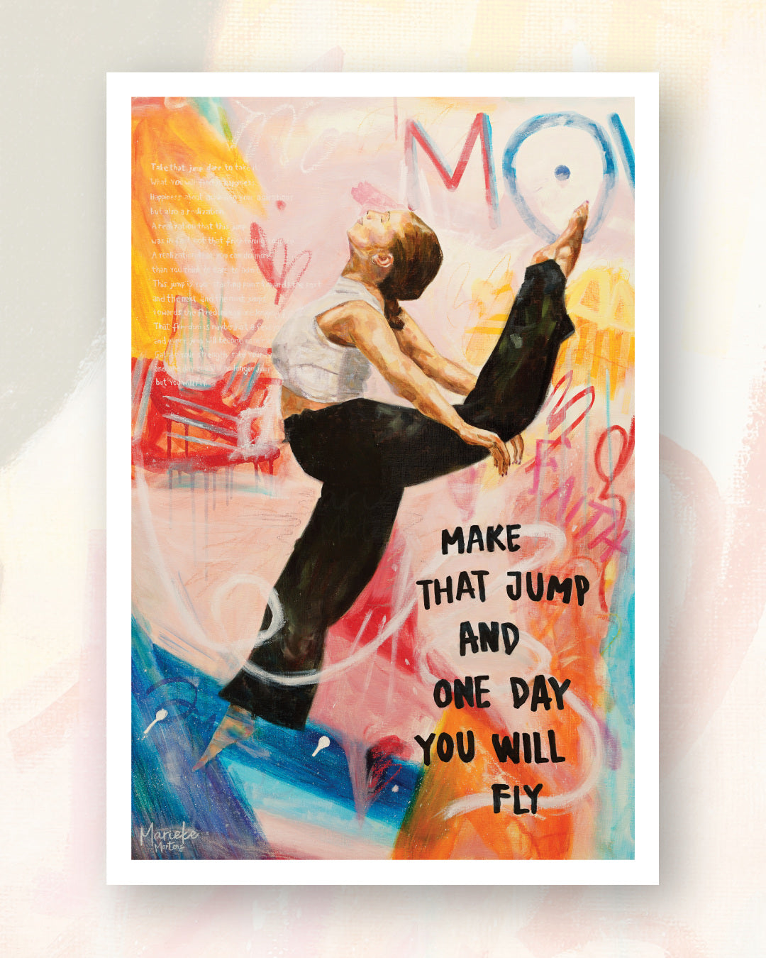 “Take that jump, dare to take it. What you will find is happiness. Happiness about achieving your aspirations, but also a realization. A realization that this jump was in fact not that frightening to make. A realization that you can do more than you think or dare to admit. This jump is your starting point towards the next and the next, and the next jumps, towards the freedom you are longing for. That freedom is maybe just a few jumps away, and every jump will become easier and easier to make. Gather your strength, take you time and one day you will no longer jump, but you will fly.”