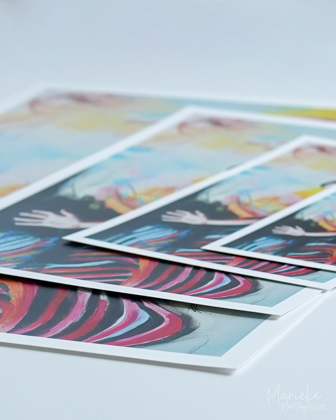 I do everything in-house, from digitizing the painting to printing, quality control, cutting, and shipping. I ensure the highest quality by using a high-color-range fine art printer and archival inks on semi-gloss, acid-free paper.